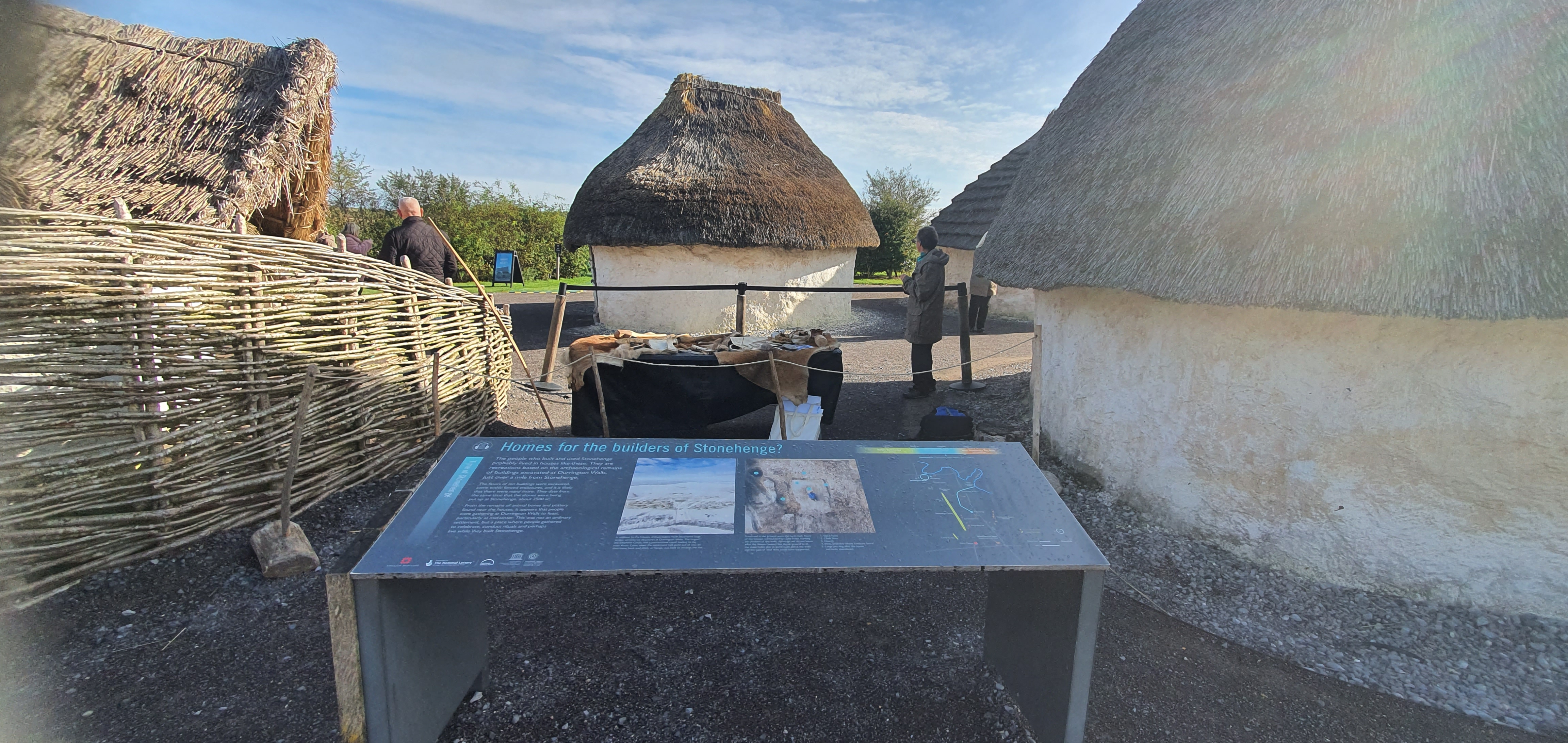 Half a dozen Neolithic houses have been lovingly recreated just outside the visitor and exhibition centre. They are very closely based on archaeological evidence from 100 plus houses in a huge ceremonial earthworks enclosure discovered in 2006/7 about a mile away at Durrington Walls. They dated from about the same time as the erection of the large Sarsen stones at Stonehenge. The houses are constructed with local hazel wood weaved around supporting stakes, with thatched straw roofs and walls of chalk daub. They give a fascinating clue to where the builders of Stonehenge lived during its construction.